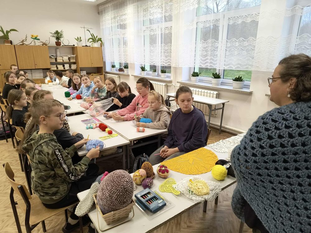 Potrzeba dużo czasu, precyzji i umiejętności. A później efekt jest zachwycający - mowa o SZYDEŁKOWANIU. Dziś w naszej szkole gościliśmy Panią BOGUSŁAWĘ FURMAN ze Stowarzyszenia Koła Gospodyń Wiejskich w Jodłowej Górnej, która przekazywała uczniom klas V i VI tajniki wiedzy na temat sztuki szydełkowania. Pani Bogusia zaprezentowała uczniom, co ciekawego udało jej się stworzyć w wolnej chwili na szydełku i w jaki sposób wykonać te rzeczy krok po kroku- a możliwości wykorzystania tej techniki jest wiele- od ozdób, zabawek, po piękne serwetki, odzież i inne przedmioty. Dzieci chętnie słuchały rad oraz wskazówek, po czym ruszyły do zajęć praktycznych. Pod czujnym okiem Pani Bogusi rozpoczęły naukę od podstawowego ściegu, czyli łańcuszka. Zadanie z pozoru łatwe, okazało się nie lada wyzwaniem dla niektórych uczniów. Pomimo napotkanych trudności, powstały pierwsze łańcuszki wykonane tą techniką.To nie były pierwsze zajęcia uczniów związane z włóknami i materiałami- na wcześniejszych zajęciach dowiedzieli się, z czego powstają materiały włókiennicze, omówili ich zastosowanie, poznali metody konserwacji odzieży. Wcielali się również w rolę kreatorów mody i projektowali stroje na różne okazje.