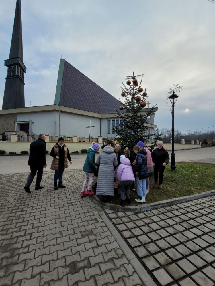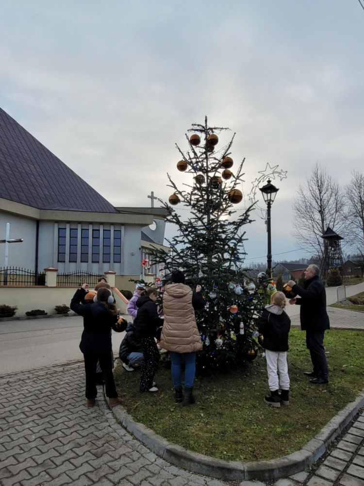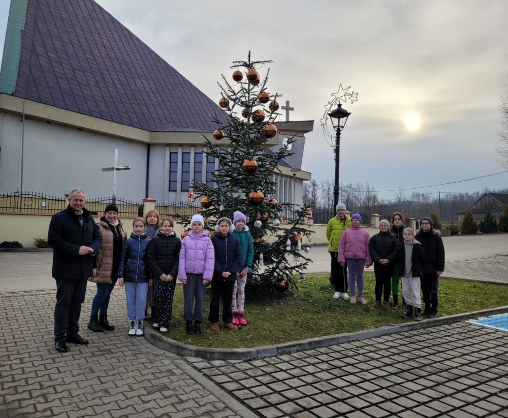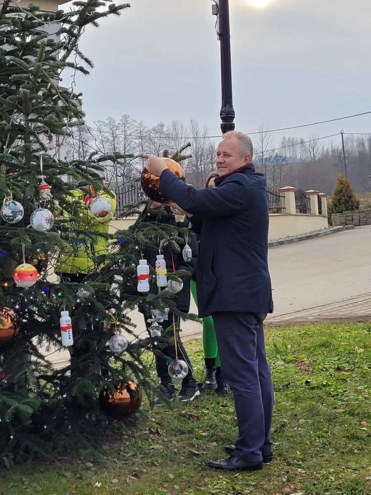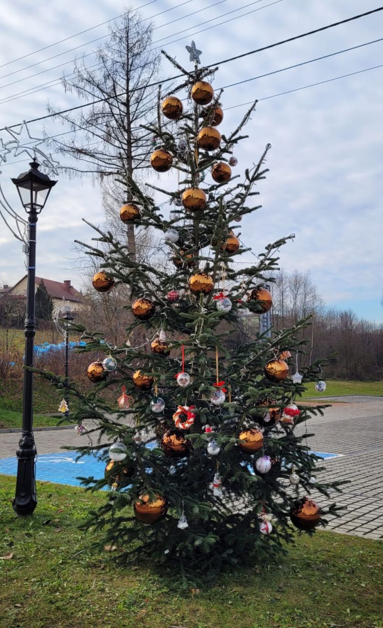 Święta już tuż tuż - dzisiaj (18.12.2025.) wspólnie z Panem Wójtem Janem Janigą i Panią Sołtys Elżbietą Łępą dekorowaliśmy choinkę przy Centrum Kultury i Sportu w Jodłowej Górnej dużymi bańkami i ozdobami wykonanymi przez uczniów naszej szkoły. Złożyliśmy również życzenia świąteczne i noworoczne Panu Wójtowi i Pani Sołtys.