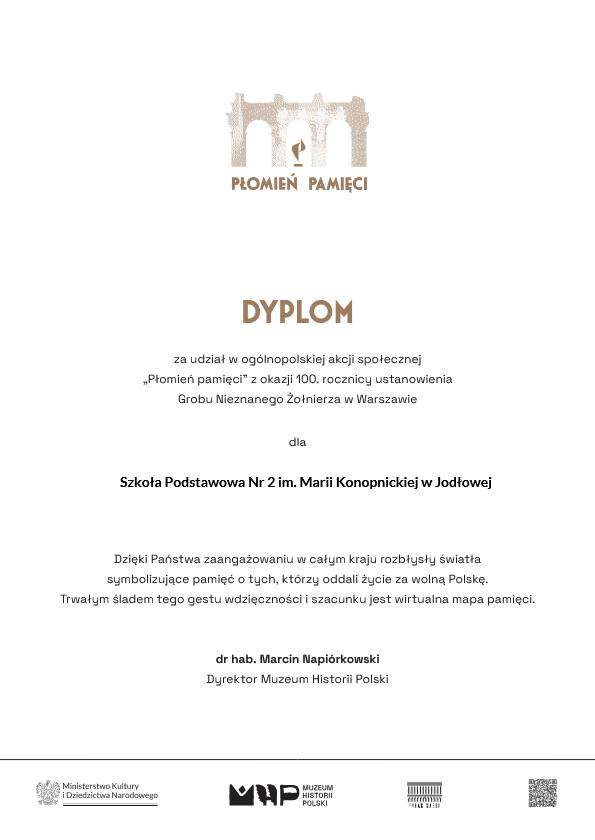 Nasza szkoła brała udział w ogólnopolskiej akcji społecznej „Płomień pamięci” z okazji 100. rocznicy ustanowienia Grobu Nieznanego Żołnierza w Warszawie zorganizowanej przez Muzeum Historii Polski, której celem jest uhonorowanie lokalnych bohaterów. Otrzymaliśmy dyplom z podziękowaniem za udział w akcji, w której w listopadzie zapaliliśmy znicz z biało-czerwonym sercem i flagą symbolizujący pamięć o tych, którzy oddali życie za wolną Polskę przy Pomniku Niepodległości w Jodłowej.