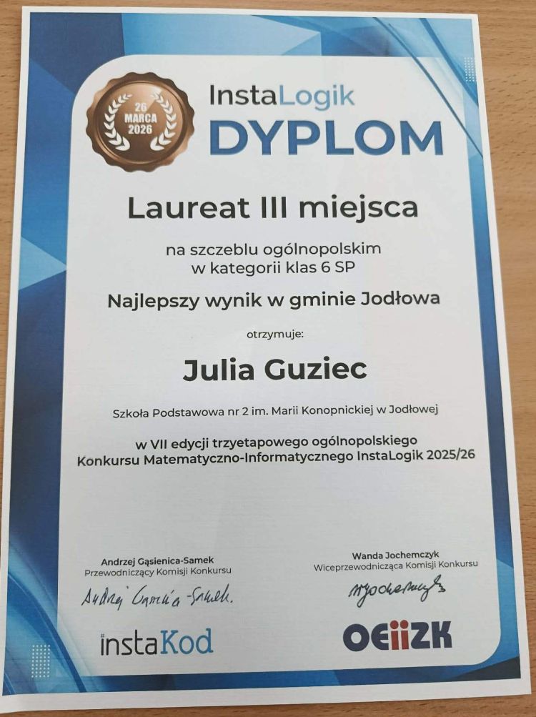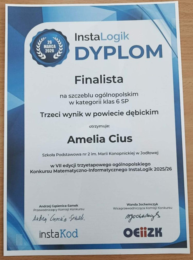 1Miło jest nam, że możemy się pochwalić kolejnymi sukcesami naszych uczniów w VII edycji ogólnopolskiego Konkursu Matematyczno - informatycznego InstaLogik 2025/2026.