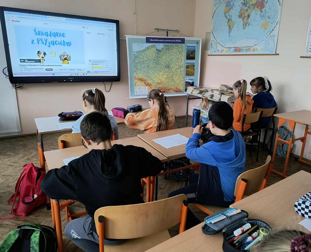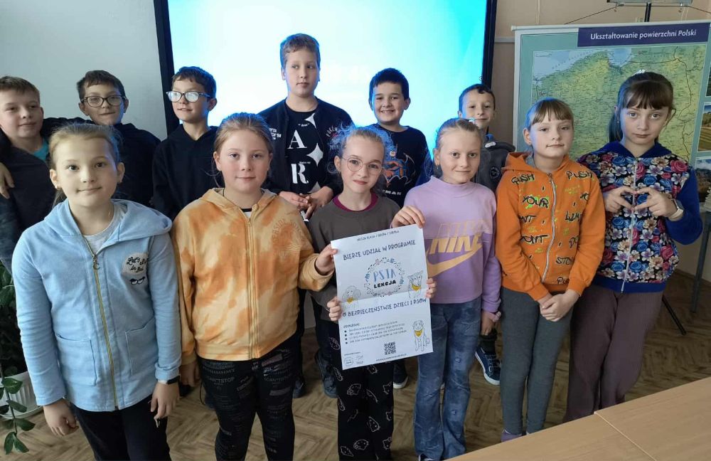 Klasa 4 bierze udział w programie "Psia lekcja - o bezpieczeństwie dzieci i psów". Uczniowie wzięli dziś udział w lekcji on-line na żywo pod nazwą "Śniadanie z PSYjaciołmi", której program obejmował bezpieczną przyjaźń dziecka z psem, jak dbać o psa i zrozumieć jego potrzeby, jak komunikują się psy oraz jak psy pomagają pacjentom w szpitalu. Uczniowie wykonywali również specjalne karty pracy. Za akcję odpowiada Stowarzyszenie Zwierzęta Ludziom