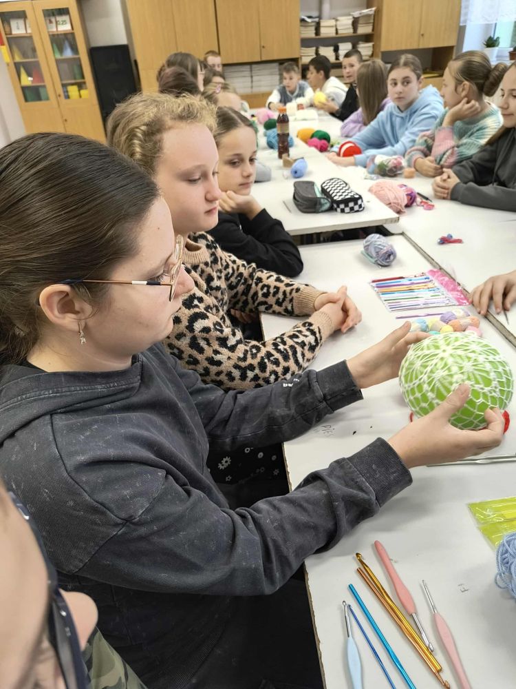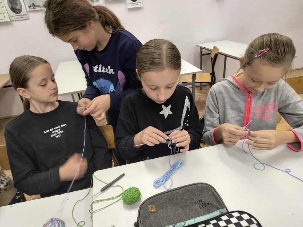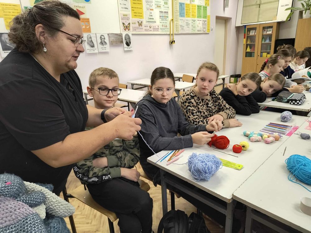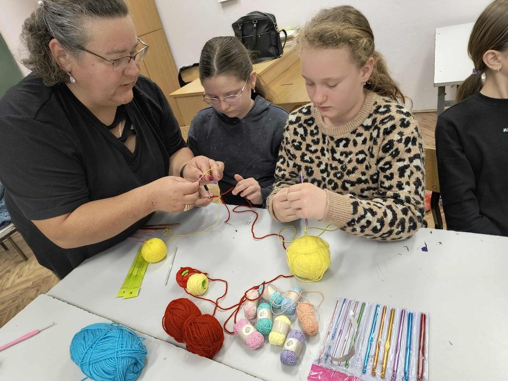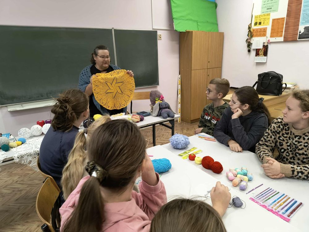Potrzeba dużo czasu, precyzji i umiejętności. A później efekt jest zachwycający - mowa o SZYDEŁKOWANIU. Dziś w naszej szkole gościliśmy Panią BOGUSŁAWĘ FURMAN ze Stowarzyszenia Koła Gospodyń Wiejskich w Jodłowej Górnej, która przekazywała uczniom klas V i VI tajniki wiedzy na temat sztuki szydełkowania. Pani Bogusia zaprezentowała uczniom, co ciekawego udało jej się stworzyć w wolnej chwili na szydełku i w jaki sposób wykonać te rzeczy krok po kroku- a możliwości wykorzystania tej techniki jest wiele- od ozdób, zabawek, po piękne serwetki, odzież i inne przedmioty. Dzieci chętnie słuchały rad oraz wskazówek, po czym ruszyły do zajęć praktycznych. Pod czujnym okiem Pani Bogusi rozpoczęły naukę od podstawowego ściegu, czyli łańcuszka. Zadanie z pozoru łatwe, okazało się nie lada wyzwaniem dla niektórych uczniów. Pomimo napotkanych trudności, powstały pierwsze łańcuszki wykonane tą techniką.To nie były pierwsze zajęcia uczniów związane z włóknami i materiałami- na wcześniejszych zajęciach dowiedzieli się, z czego powstają materiały włókiennicze, omówili ich zastosowanie, poznali metody konserwacji odzieży. Wcielali się również w rolę kreatorów mody i projektowali stroje na różne okazje.