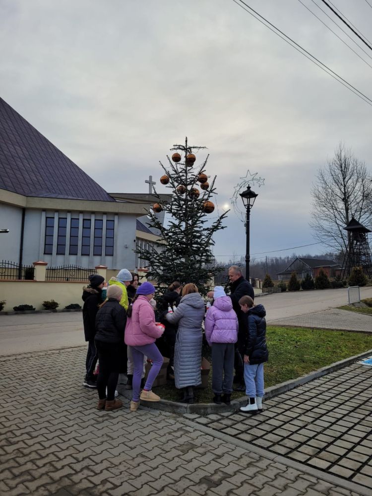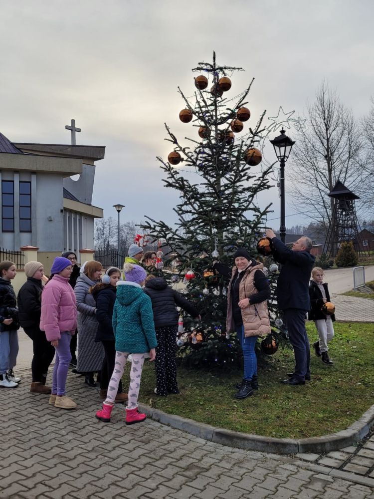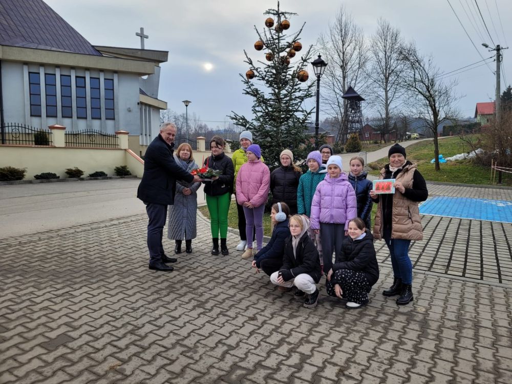 Święta już tuż tuż - dzisiaj (18.12.2025.) wspólnie z Panem Wójtem Janem Janigą i Panią Sołtys Elżbietą Łępą dekorowaliśmy choinkę przy Centrum Kultury i Sportu w Jodłowej Górnej dużymi bańkami i ozdobami wykonanymi przez uczniów naszej szkoły. Złożyliśmy również życzenia świąteczne i noworoczne Panu Wójtowi i Pani Sołtys.