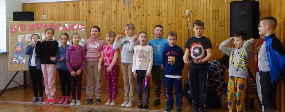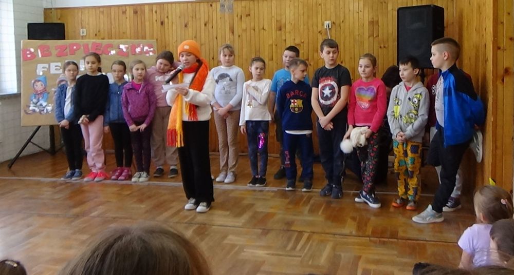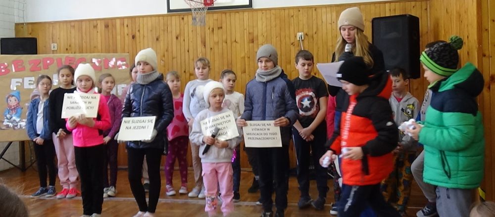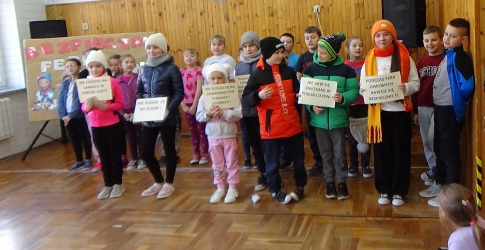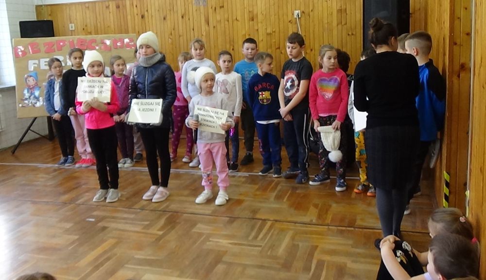 Rady i przestrogi, jak zachować się na śniegu i lodzie, miały uwrażliwić uczniów na odpowiednie zachowanie i właściwe spędzenie ferii. Młodzi artyści śpiewali piosenki zimowe, dzięki którym wszyscy obecni mogli przenieść się do zimowej krainy, w której też nie można zapomnieć o bezpieczeństwie.