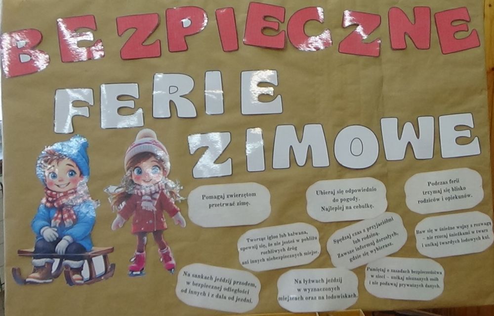 Ferie zimowe to czas wolny od zajęć szkolnych, czas pełen swobody i radości. Wszystkie dzieci zarówno te młodsze jak i starsze czekają na nie z utęsknieniem. Jednak w tym okresie nie możemy zapomnieć o właściwym zachowaniu, dlatego uczniowie naszej szkoły przygotowali apel na temat bezpieczeństwa podczas ferii.Przedstawienie skierowane zostało do wszystkich uczniów, a jego głównym celem było utrwalenie zasad bezpieczeństwa podczas zabaw zimowych.